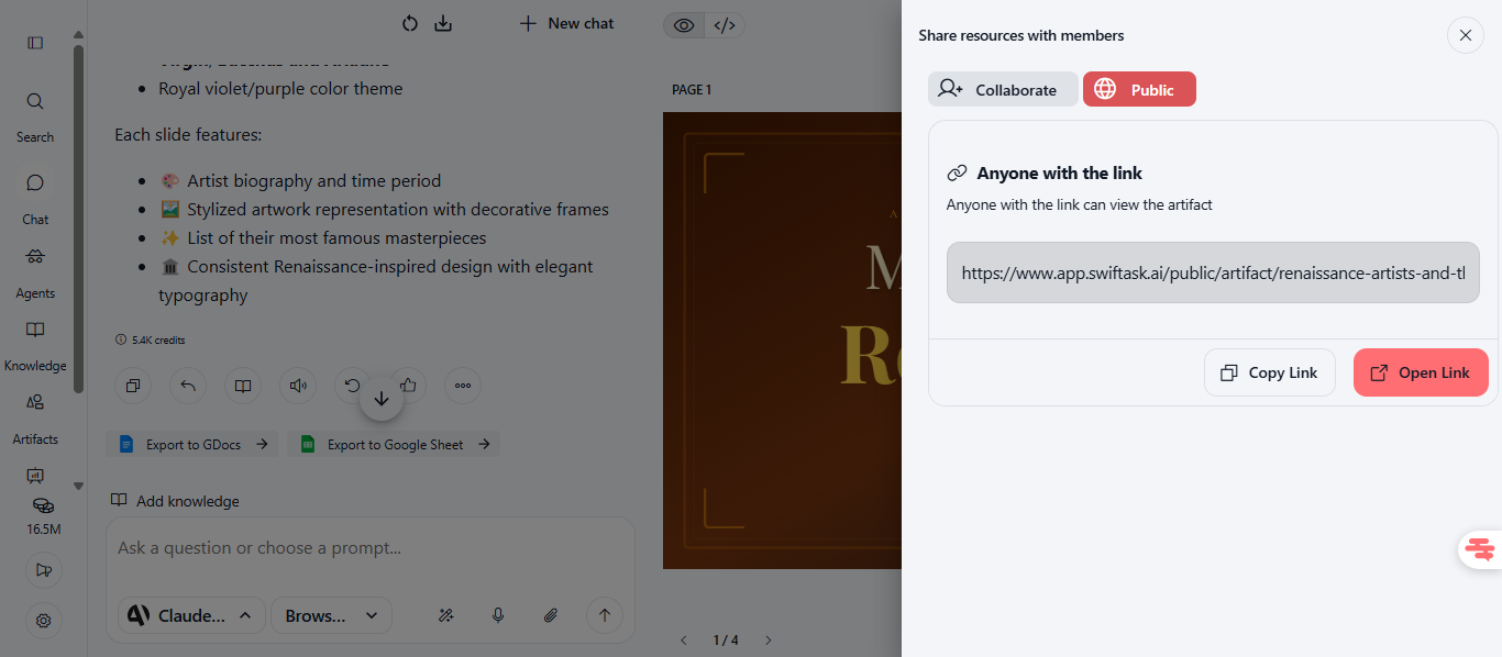 Find this feature in Artifacts → Open your slide or web page → Share → Public.