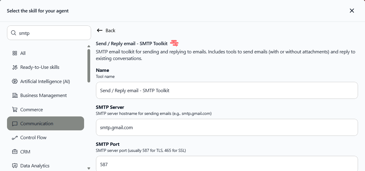 To use the SMTP functionality, go to Agent modification → Skills → Add skills → Communication → SMTP.