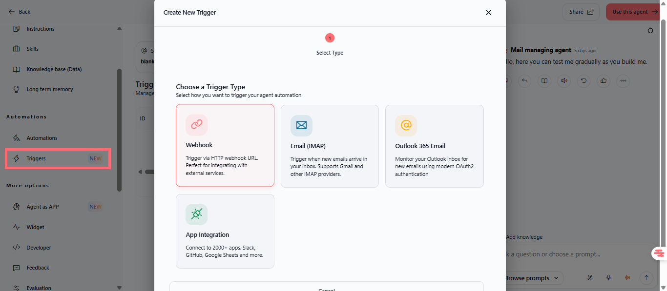 Configure triggers in Agents → [Agent Name] → Edit → Triggers.