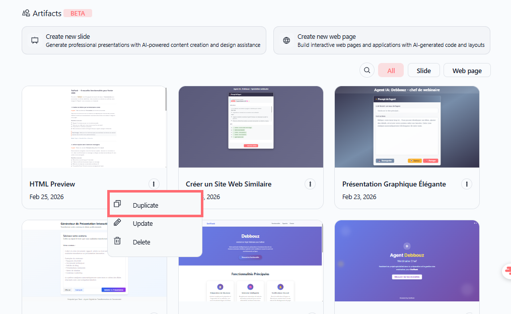 Where to find it: Artifacts → select a slide → ⋮ → Duplicate