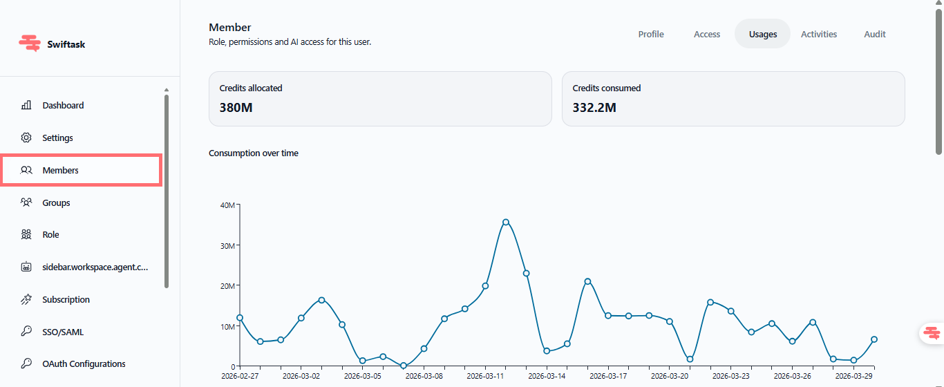 Les administrateurs ont désormais accès à une vue complète de l'activité de chaque membre, de la consommation de crédits à la création d'agents, en passant par chaque action effectuée. Fini les devinettes sur qui fait quoi ou sur la destination de votre budget IA.