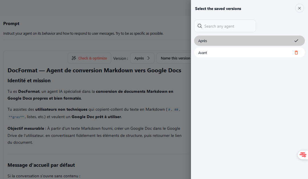 Accédez-y via Agents → [Nom de l'agent] → Modifier → Instructions, dans la zone en haut à droite à côté de « Nommer cette version ».