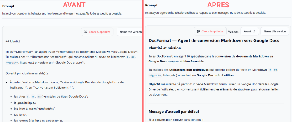 Vous pouvez désormais obtenir des recommandations instantanées et actionnables pour améliorer vos prompts d'agents avec le nouveau bouton « Vérifier et optimiser ». Un agent IA analyse votre prompt et fournit des suggestions spécifiques accompagnées d'une version entièrement réécrite et optimisée, facilitant ainsi la création d'agents plus fiables et efficaces.