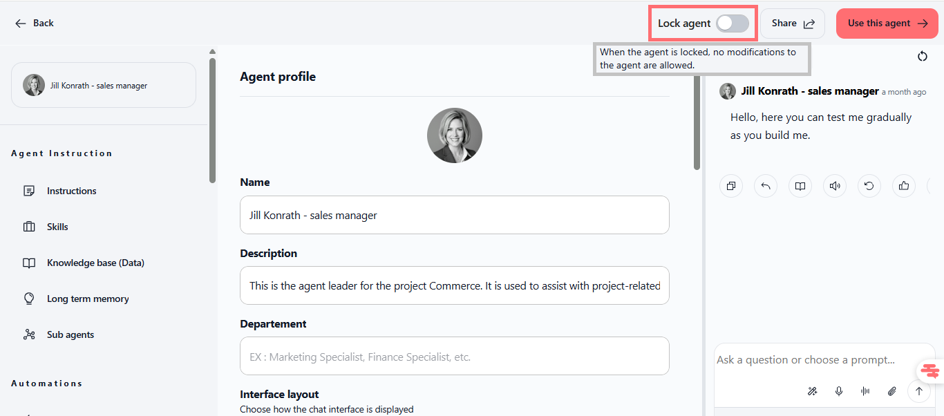 Les agents verrouillés restent pleinement fonctionnels dans le chat pour tous les utilisateurs y ayant accès.