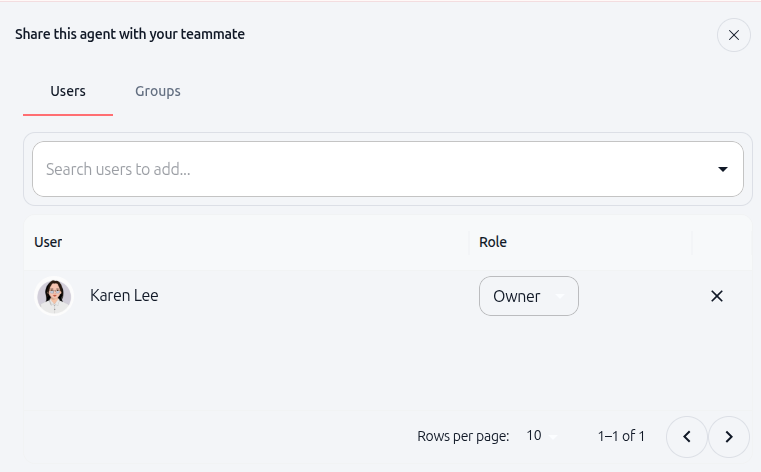 When you share an agent in Swiftask, you give specific teammates or groups access to use your agent in their own workflows. You can assign different roles to control what each person can do with the agent.